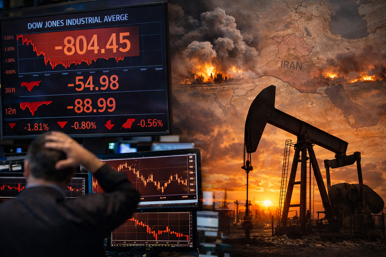 The Dow Jones Industrial Average fell more than 800 points, dropping roughly 1.8% in afternoon trading. The S&P 500 declined about 0.8%, while the Nasdaq Composite slipped approximately 0.6%, reflecting broad selling pressure across sectors as investors reassessed geopolitical and inflation risks.