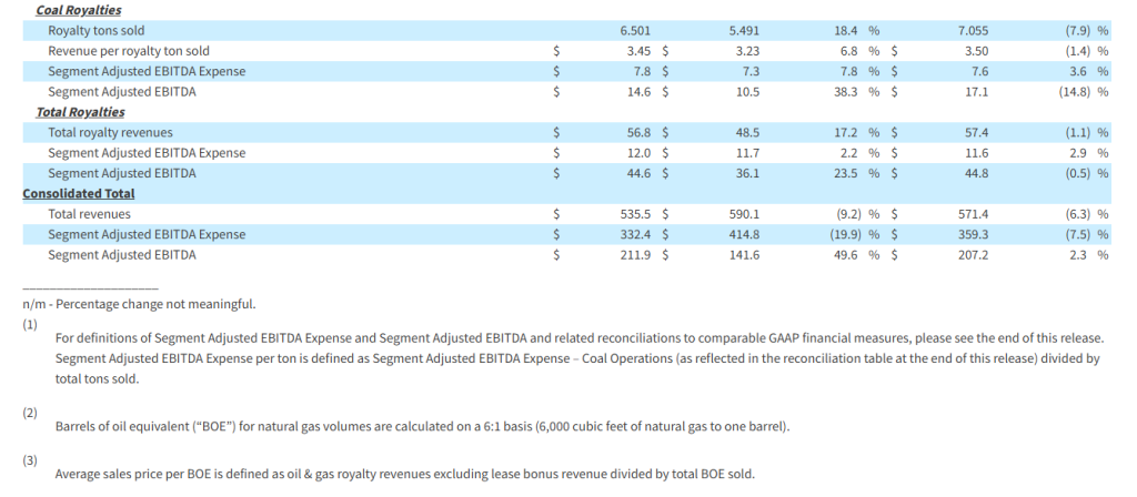 Segment Adjusted EBITDA for the Coal Royalties segment increased to $14.6 million in the 2025 Quarter compared to $10.5 million in the 2024 Quarter due to higher royalty tons sold, primarily from Tunnel Ridge, and higher average royalty rates per ton received from the Partnership’s mining subsidiaries. Compared to the Sequential Quarter, Segment Adjusted EBITDA for the Coal Royalties segment decreased 14.8% as a result of lower royalty tons sold and royalty rates per ton.