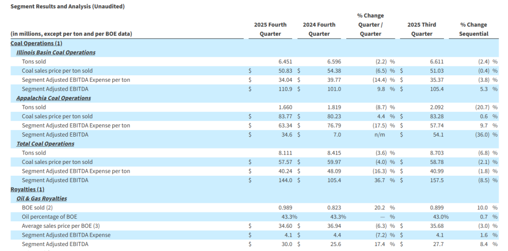 - Fourth quarter 2025 coal production volumes increased to 8.2 million tons produced, representing a year-over-year increase of 18.7%