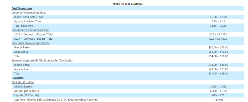 “Turning to our coal operations, we expect another year of strong operational and financial performance as we build on the progress achieved in 2025,” continued Mr. Craft. “Our 2026 guidance reflects the anticipated impact of reduced coal sales volumes at our Mettiki mine as disclosed in last week’s WARN Act notices. Notwithstanding these reductions, our guidance reflects higher planned coal sales tons in 2026, where previous capital investments in equipment and mine development are driving meaningful productivity gains with total sales tons expected to exceed 2025 levels by 0.8 million to 2.3 million tons, primarily across the Illinois Basin and at Tunnel Ridge. Customer demand across our core markets remains strong, and we have already committed and priced more than 93% of our 2026 sales tons guidance range at the midpoint.”