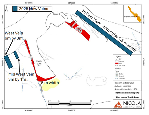 Mr. Peter Espig, CEO of Nicola Mining Inc., commented, “We have been pleasantly surprised with the work at Dominion, which clearly indicates that the project is larger than initially anticipated. For the 2026 Program, we now have 5 open faces that are accessible from the Landing to give approximately 6 metres of strike length for extraction. These exposed veins also represent attractive exploration targets as they are open at depth.”