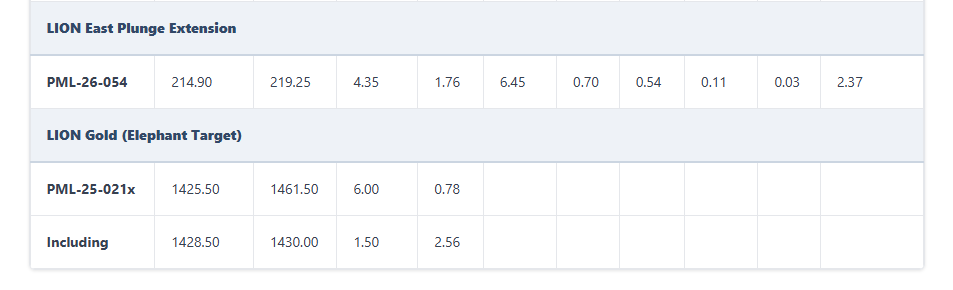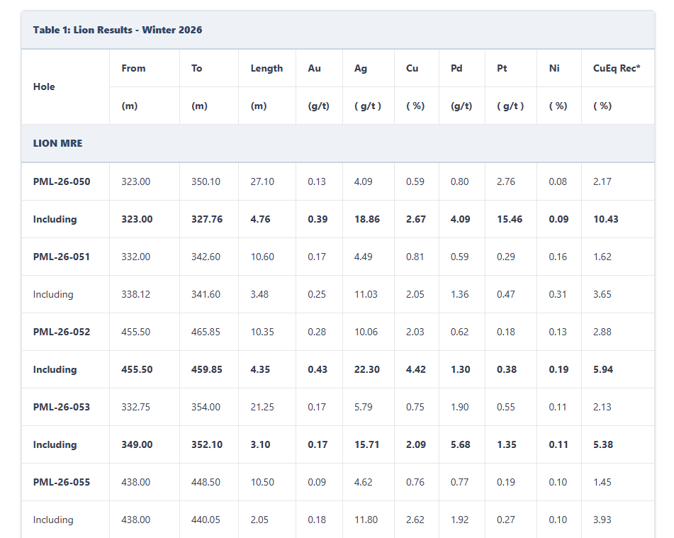 Drilling continued to define the high-grade Lion Zone in preparation for a 2026 Mineral Resource Estimate (MRE). The majority of infill drill holes in this release are for holes that are mostly defining the eastern side of the Lion zone (Figure 1) for future mineral resource estimates to an Indicated Resource classification. The 2026 winter drill campaign continues to support the modelled interpretation of the Lion Zone based on earlier wider spaced drilling and includes PML-26-050 intersected the Lion Zone and confirmed the eastern edge of the high-grade copper shoot with 4.76m @ 10.43% CuEqRec1 (Table 1).