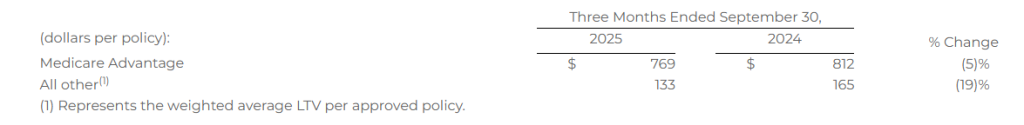 The following table shows the lifetime value of commissions per approved policy for the periods presented: