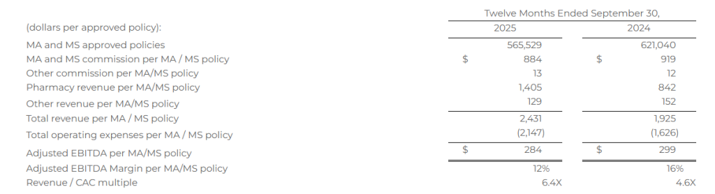 The MA and MS commission per MA/MS policy represents the LTV for policies sold in the period. Other commission per MA/MS policy represents the LTV for other products sold in the period, including DVH prescription drug plan, and other products, which management views as additional commission revenue on our agents’ core function of MA/MS policy sales. Pharmacy revenue per MA/MS policy represents revenue from SelectRx, and other revenue per MA/MS policy represents revenue from Population Health, production bonuses, marketing development funds, lead generation revenue, and adjustments from the Company’s reassessment of its cohorts’ transaction prices. Total operating expenses per MA/MS policy represents all of the operating expenses within Senior and Healthcare Services. The revenue to customer acquisition cost (“CAC”) multiple represents total revenue as a multiple of total marketing acquisition cost, which represents the direct costs of acquiring leads. These costs are included in marketing and advertising expense within the total operating expenses per MA/MS policy.